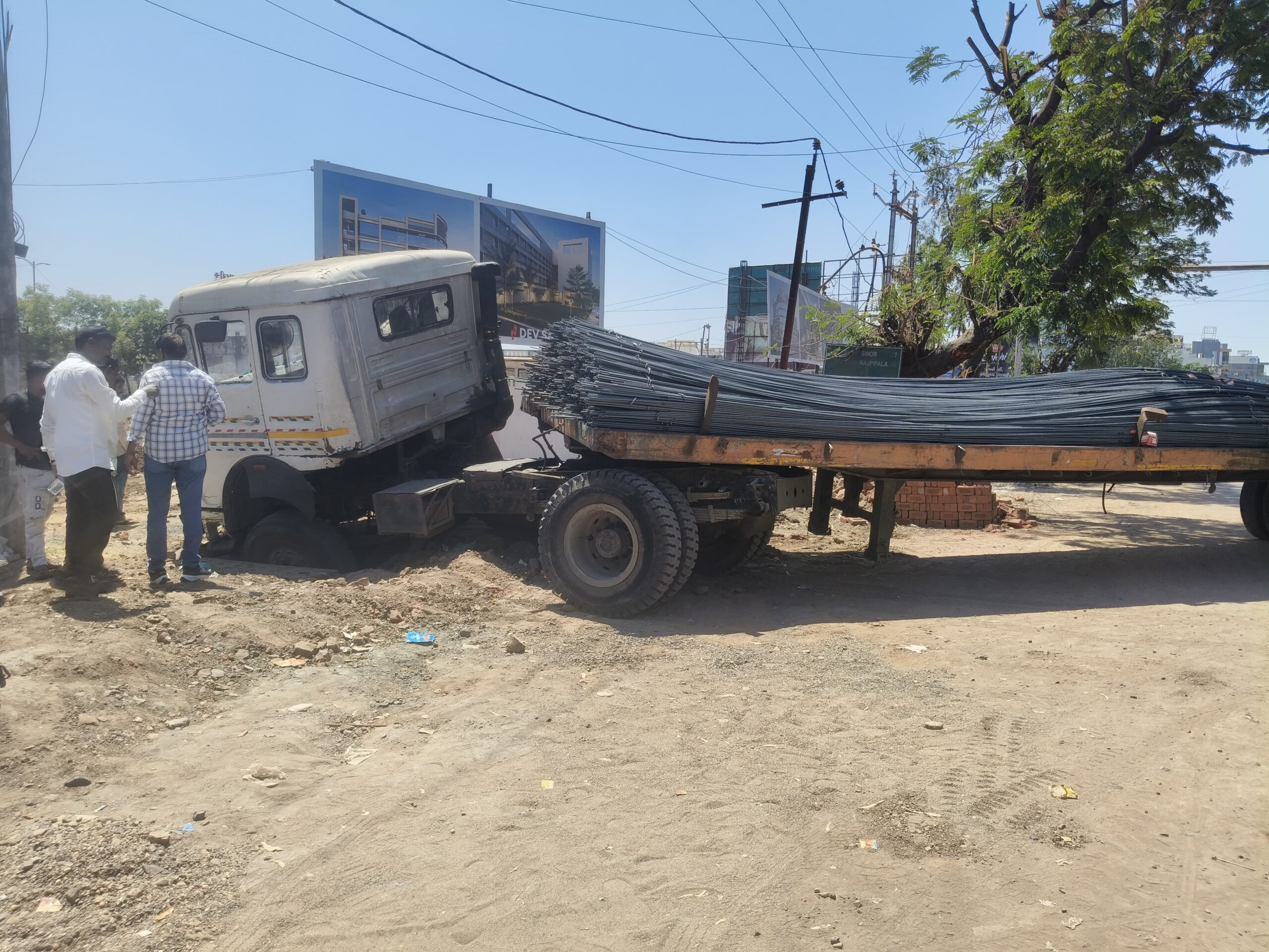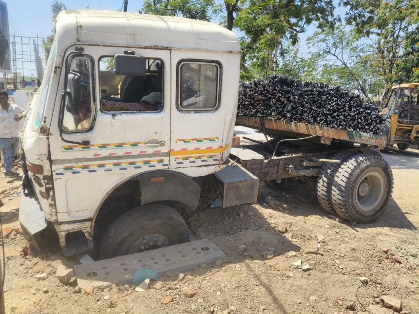 ડભોઇ શિનોર ચોકડી પાસે સળિયા ભરેલી ભારેખમ ટ્રક નવી બનેલી ગટરમાં ખૂંપી, કલાકો સુધી ટ્રાફિક જામ 100 મીટરમાં જ પોલીસ ચોકી આવેલી છે પણ પોલીસના જવાનો પણ કોઈ દેખાયા નહીં લોકોએ જાતે ટ્રાફિક ખડવો કર્યો હતો