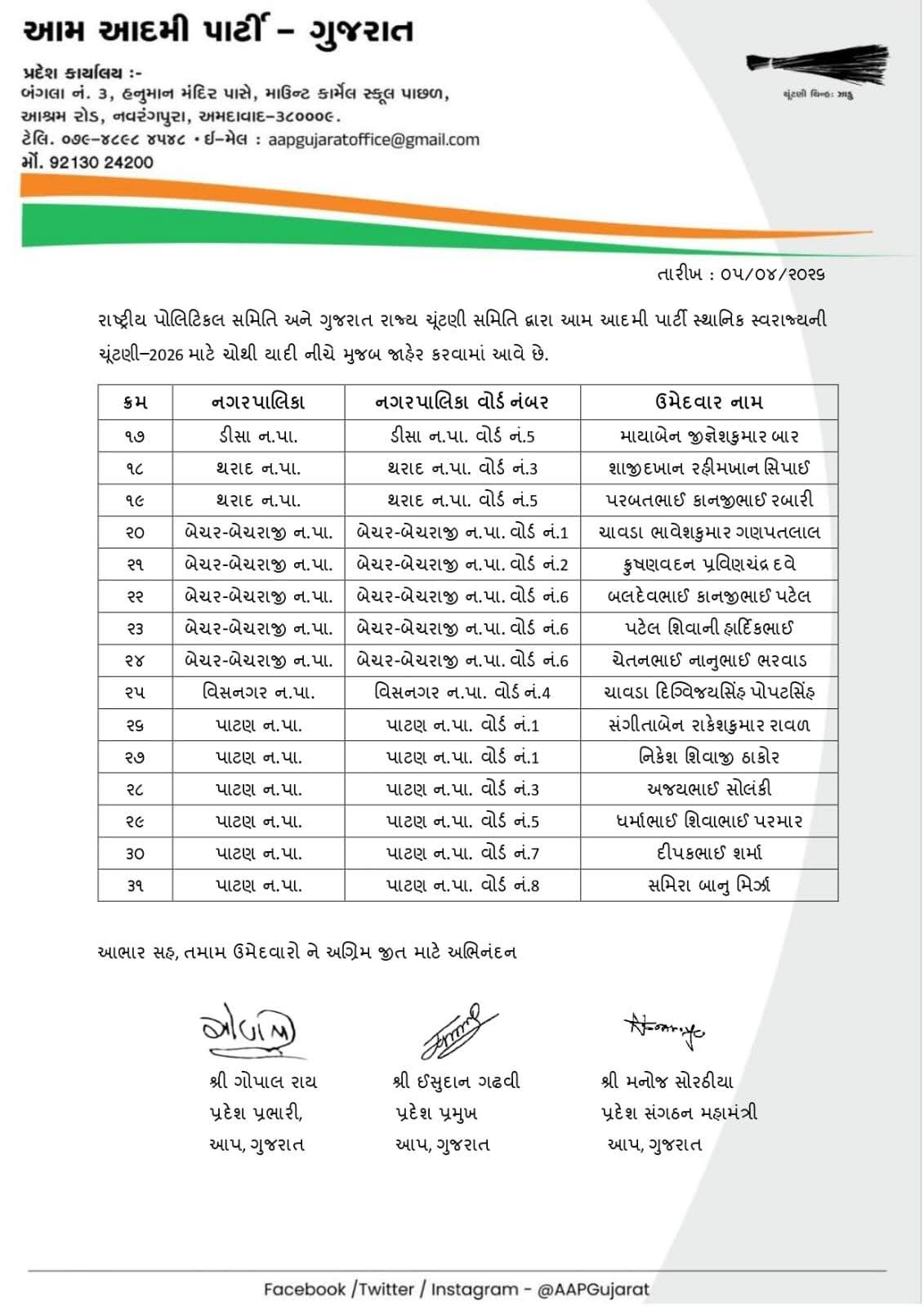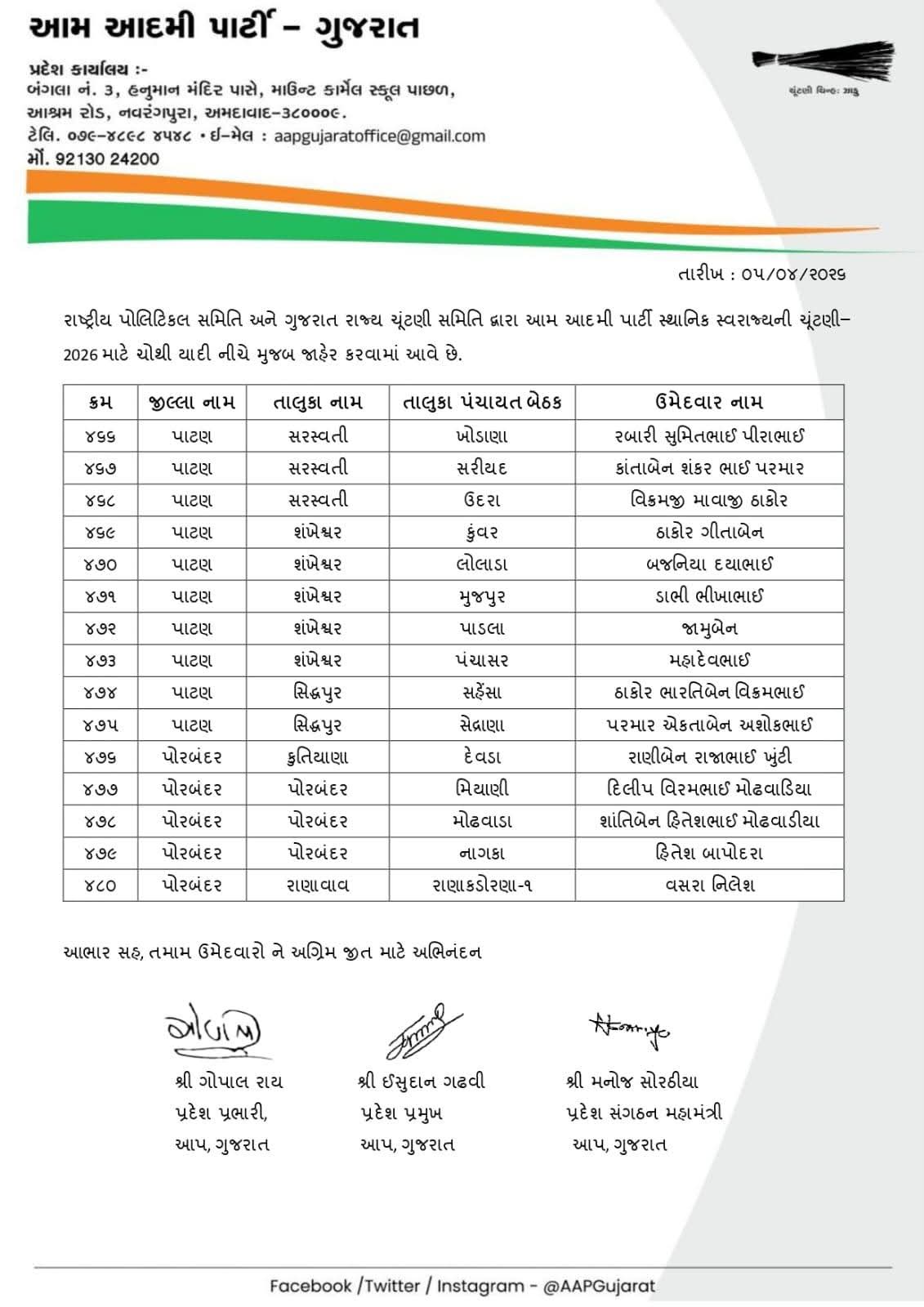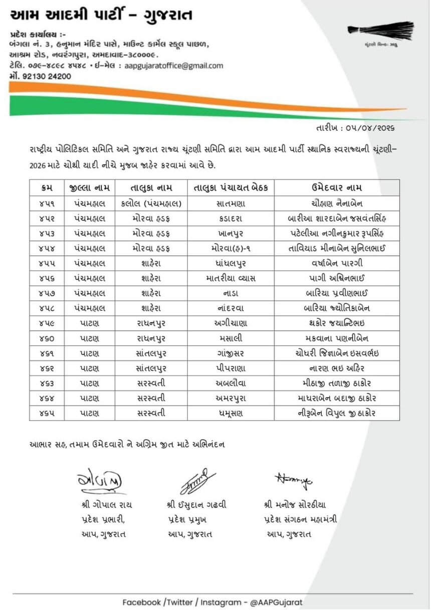 સાથે જ સરસ્વતી તાલુકા પંચાયતની અબલૌવા તાલુકા પંચાયત પરથી મીઠાજી ચતુરજી ઠાકોર, સરીયદ તાલુકા પંચાયત પરથી કાંતાબેન શંકરભાઈ પરમાર, ઉંદરા તાલુકા પંચાયત પરથી વિક્રમજી માવાજી ઠાકોર, ખોડાણા તાલુકા પંચાયત બેઠક પરથી સુમિતભાઈ પીરાભાઈ રબારી, કાનોસણ તાલુકા પંચાયત બેઠક પરથી નીરૂબેન વિપુલજી ઠાકોર સહિતના ઉમેદવાર ને આમ આદમી પાર્ટીએ જાહેર કર્યા હતા..