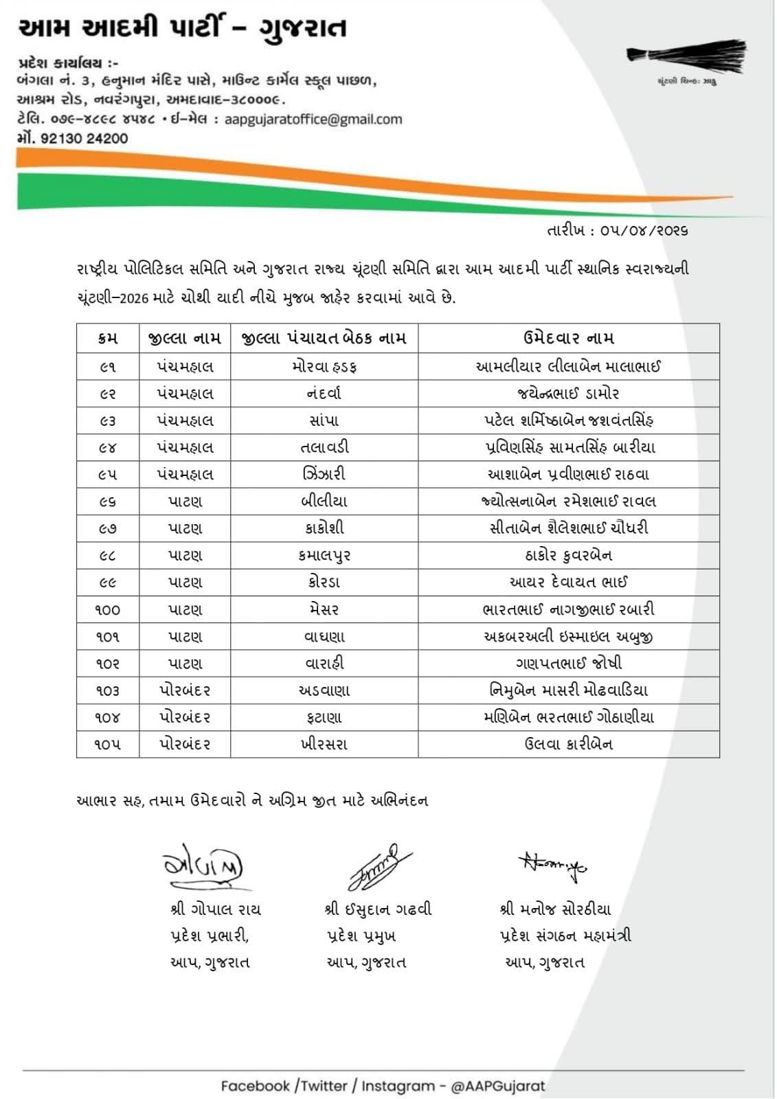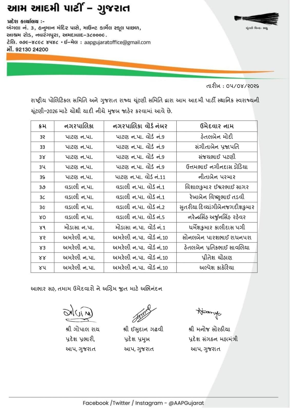 આજરોજ આમ આદમી પાર્ટી ગુજરાત દ્વારા ગુજરાતવ્યાપી પોતાના ઉમેદવારો ચોથી યાદી ની જાહેરાત કરી છે તેમાં પાટણ નગરપાલિકાના 11 બેઠકના ઉમેદવારો અને સરસ્વતી તાલુકા પંચાયતના ઉમેદવાર જાહેર કર્યા છે..