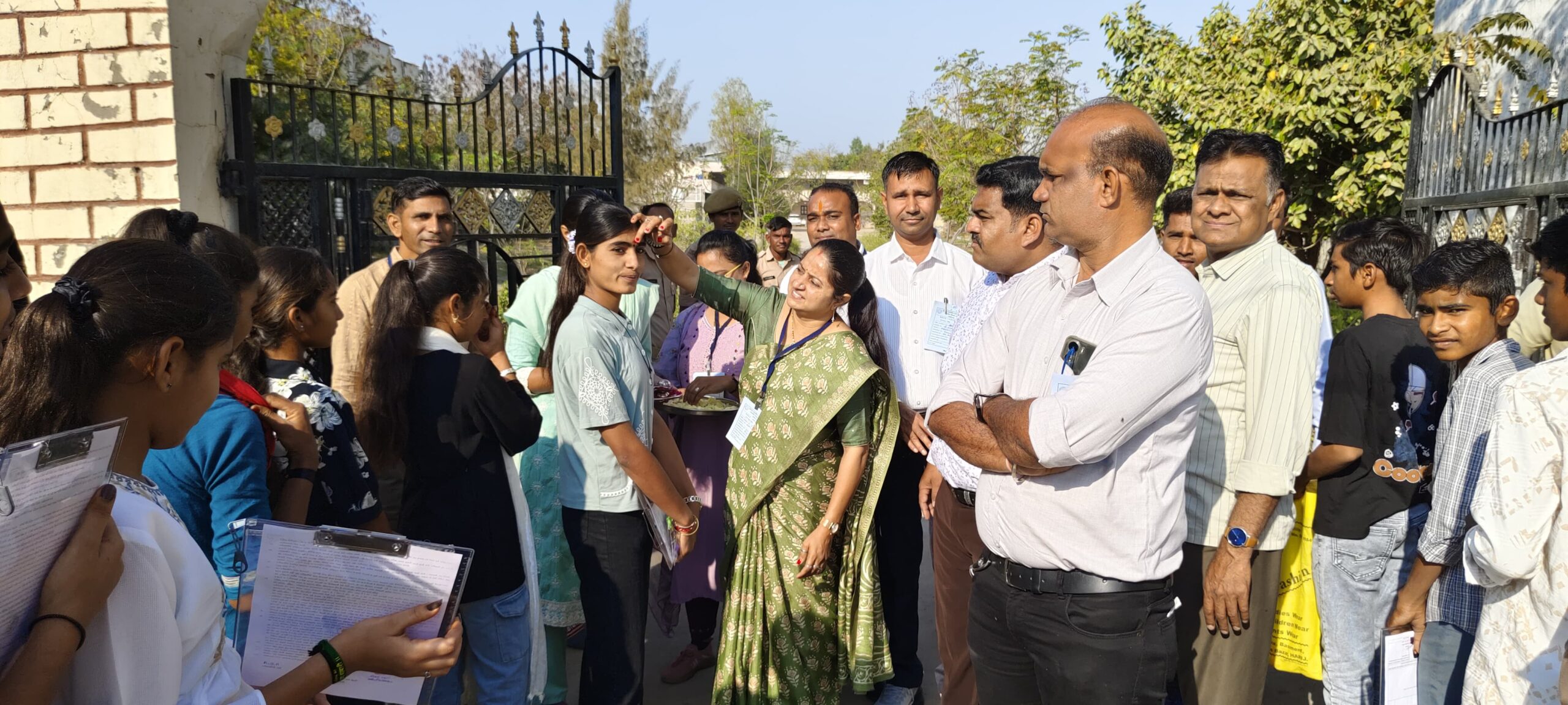 પરીક્ષાના પ્રથમ દિવસે વિદ્યાર્થીઓમાં રહેલા માનસિક તણાવ અને ભયને હળવો કરવા માટે શાળાના પ્રવેશદ્વાર પર જ શિક્ષકો દ્વારા દરેક વિદ્યાર્થીને માંગલિક કુમકુમ તિલક કરી અને મોં મીઠું કરાવી આવકાર આપવામાં આવ્યો હતો. આ અનોખી અને પ્રેરણાદાયી પહેલને કારણે વિદ્યાર્થીઓના ચહેરા પર સ્મિત અને આત્મવિશ્વાસની ઝળહળાહટ જોવા મળી હતી. વાલીઓએ પણ શાળાની આ પહેલને બિરદાવી હતી.