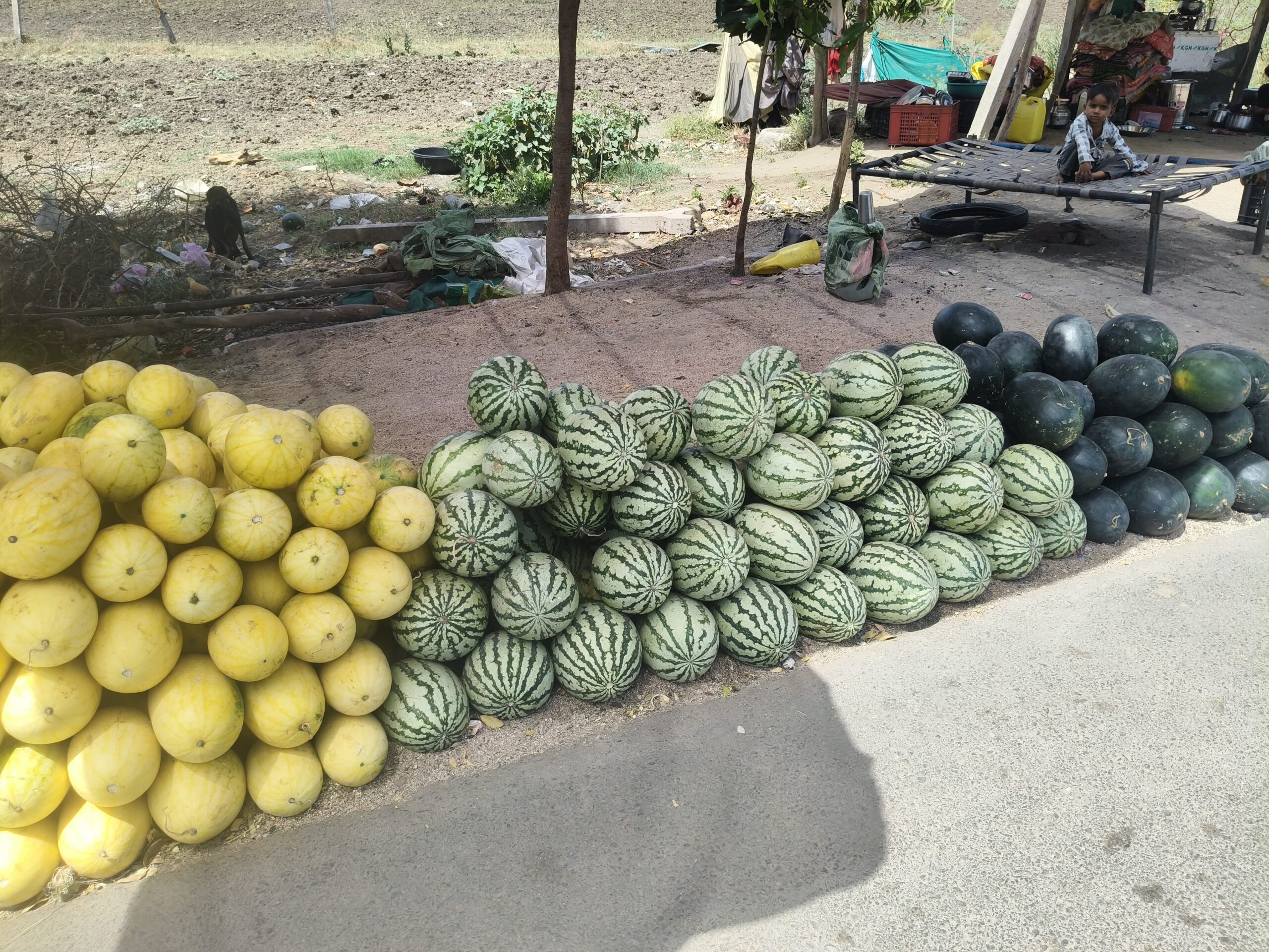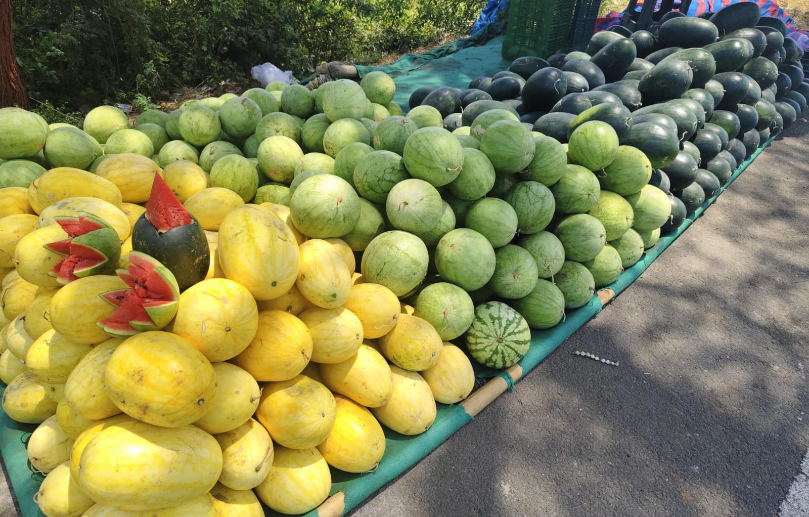 રસ્તાની ધારે ભરાયેલા આ બજારમાં હાલ ત્રણ પ્રકારના તરબૂચ જોવા મળે છે:
