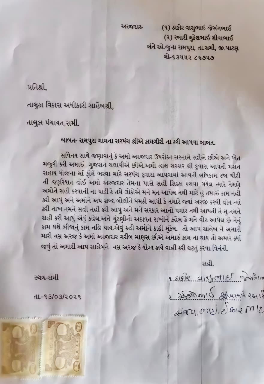 સમી તાલુકાના રામપુરા ગામમાં સરપંચ સામે ગ્રામજનોની લેખિત અરજી.